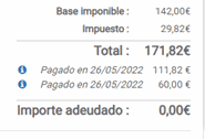 Así sucesivamente hasta que la factura quede pagada completamente. Veremos que la factura queda con importe adeudado 0 € y que la factura cambia de estado “Abierta” a “Pagada”: