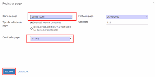 6.- Cambiamos el “Diario de pago” a Banco… Y rellenamos la cantidad a pagar y validar: