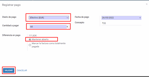 2.- Indicamos en diario de pago la forma de pago del cliente (por ejemplo, efectivo) indicando una cantidad menor del total de la factura: